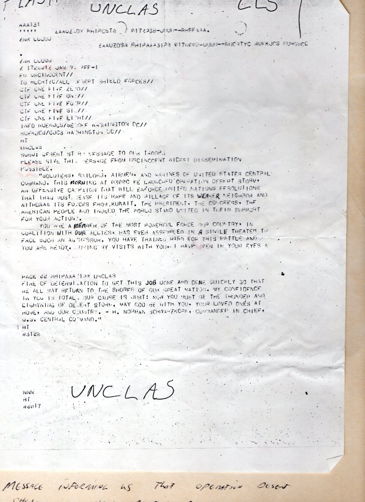 On January 17th, 1991, I had the watch in the operations tent at 501st MPs. Normally, it was nothing much more that sit in the command tent, drink coffee, and answer the radio if someone called.