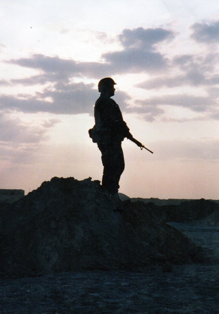 It shows an American Infantryman I encountered. He was standing on a berm in in Iraq, maintaining a watch. I liked the pose and took the picture.
