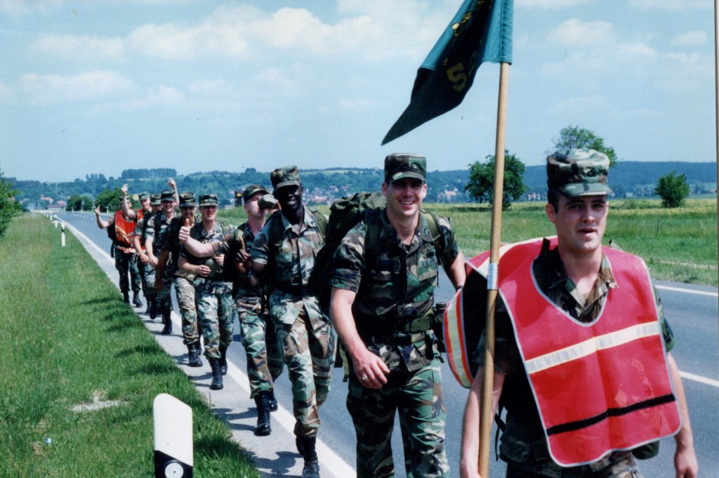 We walked through Katterbach along 14 and out into the German countryside. Our guidon carrier was out front and soon we started rotating through carrying it the company flag.