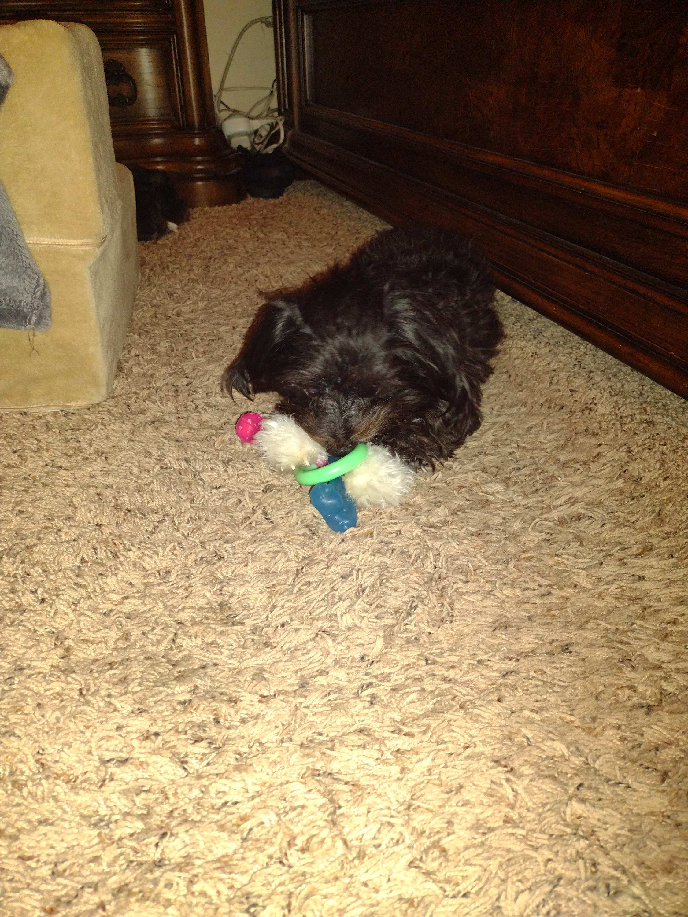 She also didn’t know how to play with toys. I got some of the toys we bought her, got on the floor, and pretended to be a puppy playing with them. Inviting her in, she got the idea and today loves her toys.