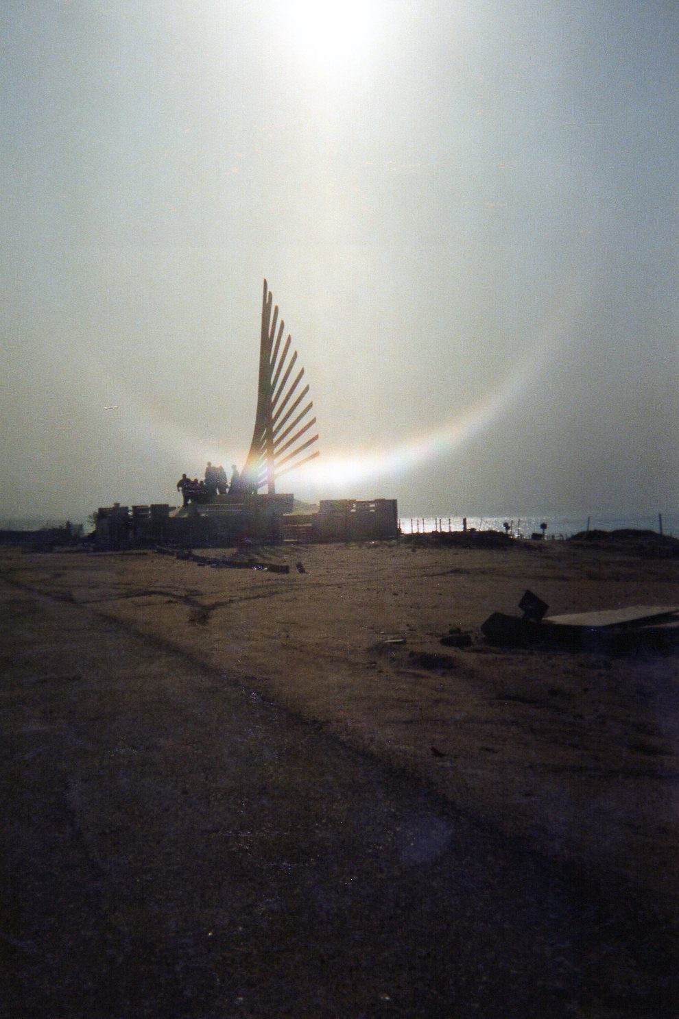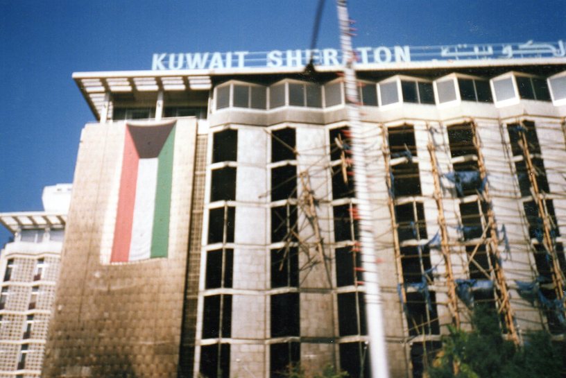 Our route took us through the city and past the Kuwait City Sheraton. The building looked like at least part of it had been fire damaged. In front of it, several men in hard hats were working. I had my camera out, snapping pictures as we drove past on our way the Gulf. That’s how the picture that would drive me nuts for years was taken.