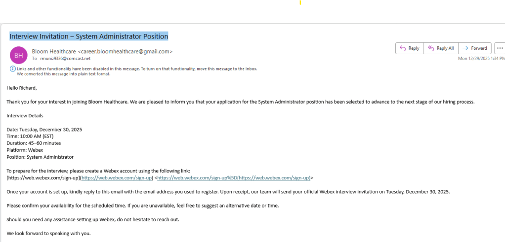 - It asked me to set up an account on webex. If any outfit wants you set up something or use some off product app to communicate with them, that’s a big flag. Something stinks here.